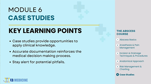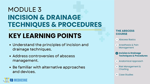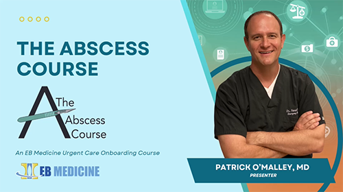 Instructor Patrick O’Malley, MD, who’s practiced in emergency medicine and urgent care, reviews the latest literature to identify evidence-based best practices for abscess management. He presents tried-and-true techniques, as well as a few novel devices, shown to have good outcomes. In his easy-to-follow, peer-to-peer instructional style, Dr. O’Malley also shares practical tips born of nearly 20 years’ experience handling thousands of abscesses with care.
