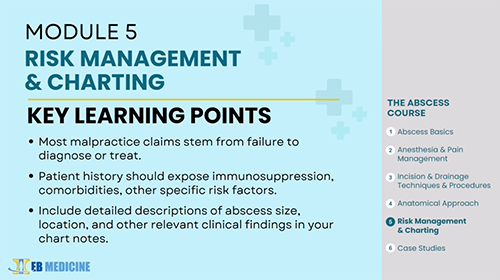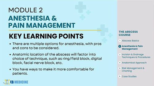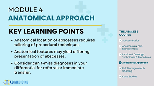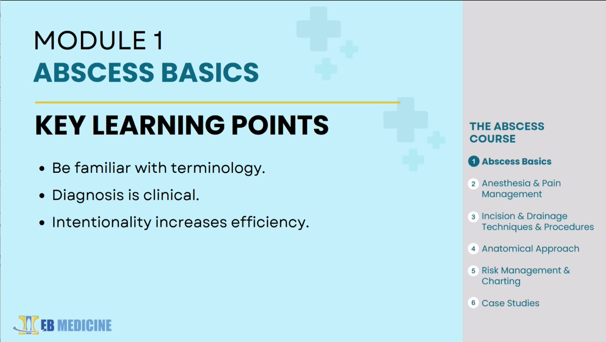 The Abscess Course prepares you to diagnose and treat all kinds of abscesses, from chalazions to paronychia, anywhere on the body, from head to toe. Six modules and multitudes of close-up, step-by-step videos cover the basics of anesthesia and pain management, incision and drainage, procedures by body system, controversies (to pack or not to pack?), novel techniques, risk management tips, and more. It also includes 5 AMA PRA Category 1 Credits™.