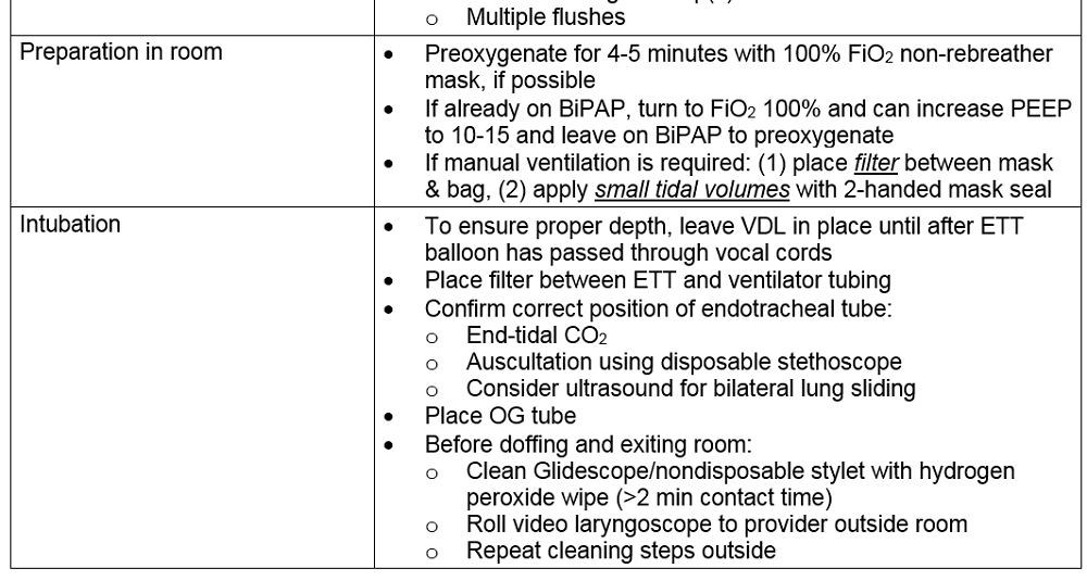 Currently, we are using a stepwise approach to respiratory management for the COVID-19 patient. Patients with pure hypoxemia will be up-titrated from room air, to nasal canula, to non-rebreather, and HFNC. Patients with increased work of breathing and tachypnea despite supplemental oxygen are candidates for a trial of CPAP/BiPAP with close monitoring. If possible, CPAP/BiPAP and HFNC should be used in negative-pressure, closed rooms. A room with a closed door (or within a full COVID-19 unit) with all providers using N95 masks, is an option if negative pressure is not available. Additionally, a surgical mask can be placed over the HFNC to help decrease the amount of aerosolization. If intubation is necessary, the Mount Sinai Health System has developed a systemwide protocol for airway management as a collaboration between the Department of Emergency Medicine, the Institute for Critical Care Medicine, and the Department of Anesthesiology.3 This protocol was based on recommendations from both the Society of Critical Care Medicine and the American Society of Anesthesiologists. They have been updated regularly, with both new data and experience gained taking care of COVID patients.28-31