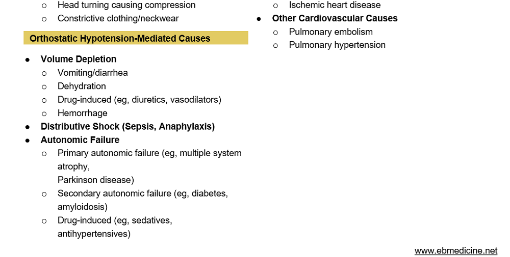 - Sarasin FP, Louis-Simonet M, Carballo D, et al. Prevalence of orthostatic hypotension among patients presenting with syncope in the ED. Am J Emerg Med. 2002;20(6):497-501. (Prospective observational; 650 patients)