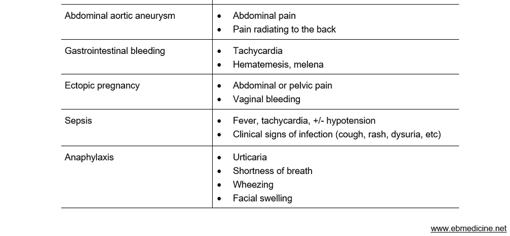 Any patient with neurologic deficit, headache, chest pain, abdominal pain, or persistently abnormal vital signs should not be diagnosed with isolated, benign syncope unless more serious diagnoses are excluded. See Table 2, for clinical findings that suggest a life-threatening etiology; note that all have presenting features other than isolated TLOC.