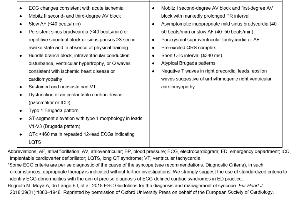 - Pérez-Rodon J, Martínez-Alday J, Barón-Esquivias G, et al. Prognostic value of the electrocardiogram in patients with syncope: data from the group for syncope study in the emergency room (GESINUR). Heart Rhythm. 2014;11(11):2035-2044. (Retrospective observational; 524 patients)