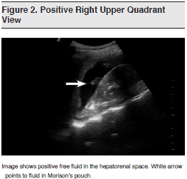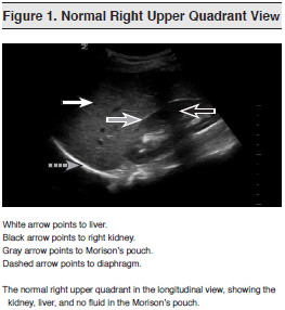 As early as 1971, the utility of ultrasound scanning for patients with splenic injuries was documented.2 It was not until the early 1990s, however, that ultrasound became widely advocated and studied in patients with blunt abdominal trauma.3-6 Since then, ultrasound has been included in the Advanced Trauma Life Support protocol of the American College of Surgeons6 and in the Eastern Association for the Surgery of Trauma (EAST) guidelines for the management of blunt abdominal trauma.8 The American College of Radiology also recommends the use of ultrasonography — and specifically, the FAST scan — to evaluate for free or localized intra-abdominal fluid collections.9 (See Figures 1 and 2)