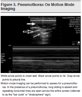 The use of ultrasound to detect pneumothorax has been well established. Lichtenstein and Menu showed that in patients in the intensive care unit (ICU), bedside ultrasound has a sensitivity of 95.3%, a specificity of 91.1%, and a negative predictive value of 100% when compared with CT scanning as the reference standard for the detection of pneumothorax.22 In ICU patients with radio-occult pneumothoraces, the same group showed that ultrasound was superior to plain radiography for the detection of pneumothorax, with a specificity approaching 100%.23 Both of these studies were conducted in ICU patients in whom disease processes such as fibrotic lung disease and acute respiratory distress syndrome may affect the quality of the sonogram, resulting in both false-positive and false-negative studies.