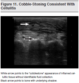 An increasing body of literature has demonstrated the utility of BUS in the management of soft tissue infections in the ED by aiding in the differentiation between cellulitis and abscess, as well as localizing and guiding drainage of fluid collections.79-81 (See Figures 10 and 11.) Ultrasound has been shown to be superior to the physical examination and to alter the management of patients with soft-tissue infections.