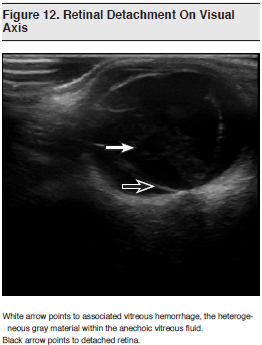 Since the anterior and posterior chambers of the eye contain vitreous fluid, the eye is an ideal acoustic window for ultrasound imaging. Moreover, the contralateral eye can serve as a normal control for the symptomatic eye. Structures such as the anterior chamber, lens, posterior chamber, retina, and optic nerve can all be visualized. As such, conditions such as retinal detachment, vitreous hemorrhage, ocular foreign bodies, lens dislocation, retrobulbar hematoma, and globe rupture can be detected on BUS. (See Figure 12.) Because of the dynamic nature of ultrasound imaging, extraocular eye movements and pupillary response can also be visualized on ultrasound, even when swollen lids prevent direct visualization.101