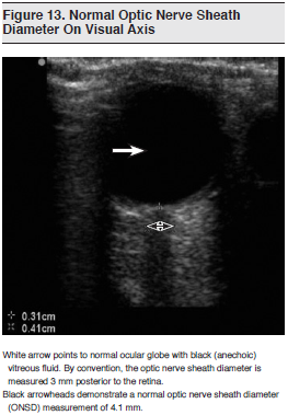 There is a growing body of literature describing the use of ocular ultrasound as a noninvasive method to detect elevated intracranial pressures (ICP). Increased ICP is transmitted through the subarachnoid space surrounding the optic nerve, causing expansion of the optic nerve sheath. The optic nerve sheath diameter (ONSD) can be measured on ultrasound using either the visual axis (probe placed directly over the closed eyelid in transverse orientation) or the coronal axis (probe placed temporally and directed nasally).108 (See Figure 13.) The approach most widely used is the visual axis, which measures the diameter of the optic nerve sheath at a point 3 mm posterior to the globe.109 Unlike most BUS examinations, which are adept at “ruling in” pathology, the current literature suggests that an ONSD of less than 5 mm may have excellent specificity for “ruling out” elevated ICP.