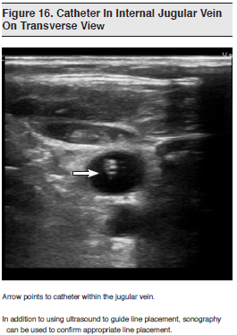Central venous catheterization is a procedure that is often required for critically ill ED patients. Although this is generally a safe procedure, the complication rate has been reported to vary from 3% to as high as 20% in some studies.119-121 Complications range from minimal to life-threatening and include arterial cannulation, pneumothorax, cardiac tamponade, air embolus, hematoma formation, and injury to adjacent neurovascular structures. The goal of real-time ultrasound is to enable the operator to visualize the target vessel and surrounding structures before and during needle insertion. (See Figure 16.) While the traditional landmark technique is successful in many cases, factors such as patient body habitus, prior cannulation, the presence of scar tissue or thrombus, and variant anatomy can all make the landmark approach to vascular access more difficult.