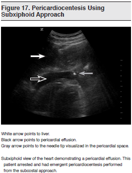 For years, clinicians have been instructed to carry out emergent pericardiocentesis using a blind subxiphoid approach, with a complication rate reported to be near 50%.152 Complications include ventricular puncture, coronary vascular laceration, pneumothorax, visceral abdominal puncture, and diaphragmatic injury. Bedside cardiac ultrasound guidance during this procedure has been shown by multiple authors to decrease the risk of these complications.153-157 (See Figure 17.) The largest of these studies examined a series of 1127 patients over a period of 21 years and noted a complication rate below 5%, well below the rate reported for standard pericardiocentesis using the landmark-based approach. The same group published a study of pericardiocentesis in pediatric patients in which the use of ultrasound guidance not only resulted in a lower complication rate but also reduced the need for repeat drainage and surgical intervention, probably owing to more accurate catheter placement and increased drainage made possible by direct ultrasound visualization.158 Interestingly, most authors note that the subxiphoid approach may not be the optimal approach, and that with ultrasound guidance, the parasternal or apical approach may provide more direct access to pericardial fluid.