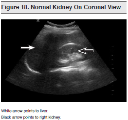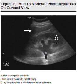 Hydronephrosis is noted on ultrasound when dilatation of the calyces and pelvis result in anechoic areas within the central collecting system. (See Figure 19) Use of color-flow Doppler can help differentiate between renal vasculature and hydronephrosis. When hydronephrosis is noted, it is important to determine whether the obstruction is unilateral or bilateral and, if possible, intrinsic or extrinsic. Hydronephrosis is usually graded as follows: mild (defined by prominent calyces and mild splaying of the renal pelvis), moderate (characterized by a bearclaw appearance), or severe (defined by the presence of cortical thinning). Of note, hydronephrosis may be challenging to appreciate in volume-depleted patients; such patients may need to be hydrated first.