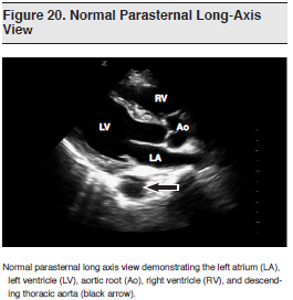 Emergency echocardiography is a core application of emergency ultrasound and is a key element of the FAST examination.1,176,177 Although comprehending image orientation178 and acquiring images can be somewhat challenging, emergency echocardiography has had a major impact on emergency clinicians’ ability to detect cardiac abnormalities and on patient care and can be life-saving.179 (See Figure 20.) It provides emergency clinicians with time-sensitive anatomic and physiologic information in a variety of cardiac-related scenarios, including cardiac arrest, unexplained hypotension, syncope, shortness of breath, and chest pain.180-183 Emergency echocardiography can help risk-stratify patients in the ED and further guide resuscitative efforts.184,185 At times, the information and disorders noted on focused cardiac ultrasound are vast and may surpass what the emergency clinician is able to appreciate and integrate. As per the American Society of Echocardiography (ASE)/ACEP Consensus Statement, the ability to assess global left ventricular function and detect pericardial effusions and right heart dilatation (chamber sizes) are within the scope of emergency clinicians and can help answer critical patient management questions.186,187