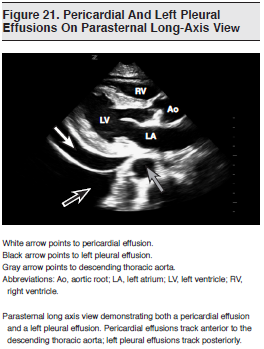 Pericardial fluid typically appears as an anechoic space between the epicardium and the pericardium. (See Figure 21.) Ultrasound is an ideal modality to detect the presence of pericardial fluid and its impact on right heart filling.177,189,190 Although cardiac tamponade is largely a clinical diagnosis, emergency echocardiography may demonstrate findings consistent with impending tamponade prior to the development of physical examination findings and hemodynamic compromise.191-193 The amount of fluid required to impair filling and cause circulatory failure depends on the rate of accumulation. Pericardial effusions may be graded as small (less than 10 mm), moderate (10-15 mm), or large (greater than 15 mm).193-196