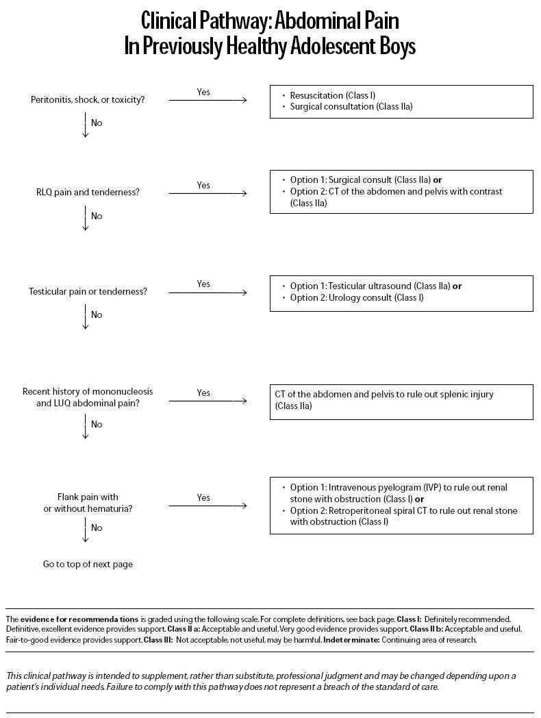 If the diagnosis remains in doubt, but the patient does not require additional testing or consultation, arrange for repeat evaluation in 8-12 hours. If the pain is relentless and the diagnosis is unclear, continued observation with repeat evaluations in the ED may be very helpful. In such cases, abdominal ultrasound or CT can help identify serious causes of abdominal pain, including those with unusual or rare diagnoses.1,91 If the child appears ill or has a worrisome examination, involve the surgical consultant at an early stage.