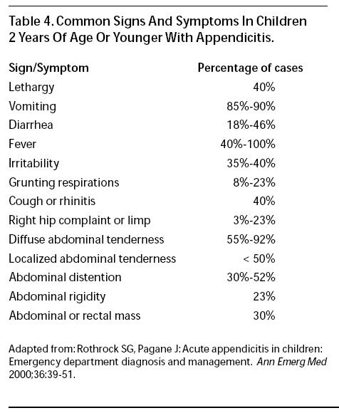 Unfortunately, young children are poor historians and localize abdominal pain poorly. This may be responsible for the fact that as many as 60%-100% of toddlers will perforate by the time they are diagnosed. 10,11 In one study of 120 children 5 years of age or younger, more than 40% of the patients had a delayed diagnosis while nonsurgical diagnoses were explored.11 Children 2 years of age or younger with appendicitis commonly have symptoms or signs, including cough, rhinitis, grunting respirations, and walking with a limp, that lead the emergency physician or pediatrician away from the correct diagnosis.12 (See Table 4.)