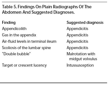 Plain films should not be routine in the evaluation of suspected appendicitis. Occasionally, an appendicolith may be visualized on plain film. (See Table 5.) Unfortunately, specific findings (some of which are quite subtle) are seen in as few as 24% of patients with appendicitis and as many as 60% of patients without appendicitis.58 In one study involving cases of suspected appendicitis, 79% of abdominal x-rays were normal.35 In a more recent study, the cost involved in making a correct diagnosis based on plain film was $1593, compared to $270 for computed tomography.59